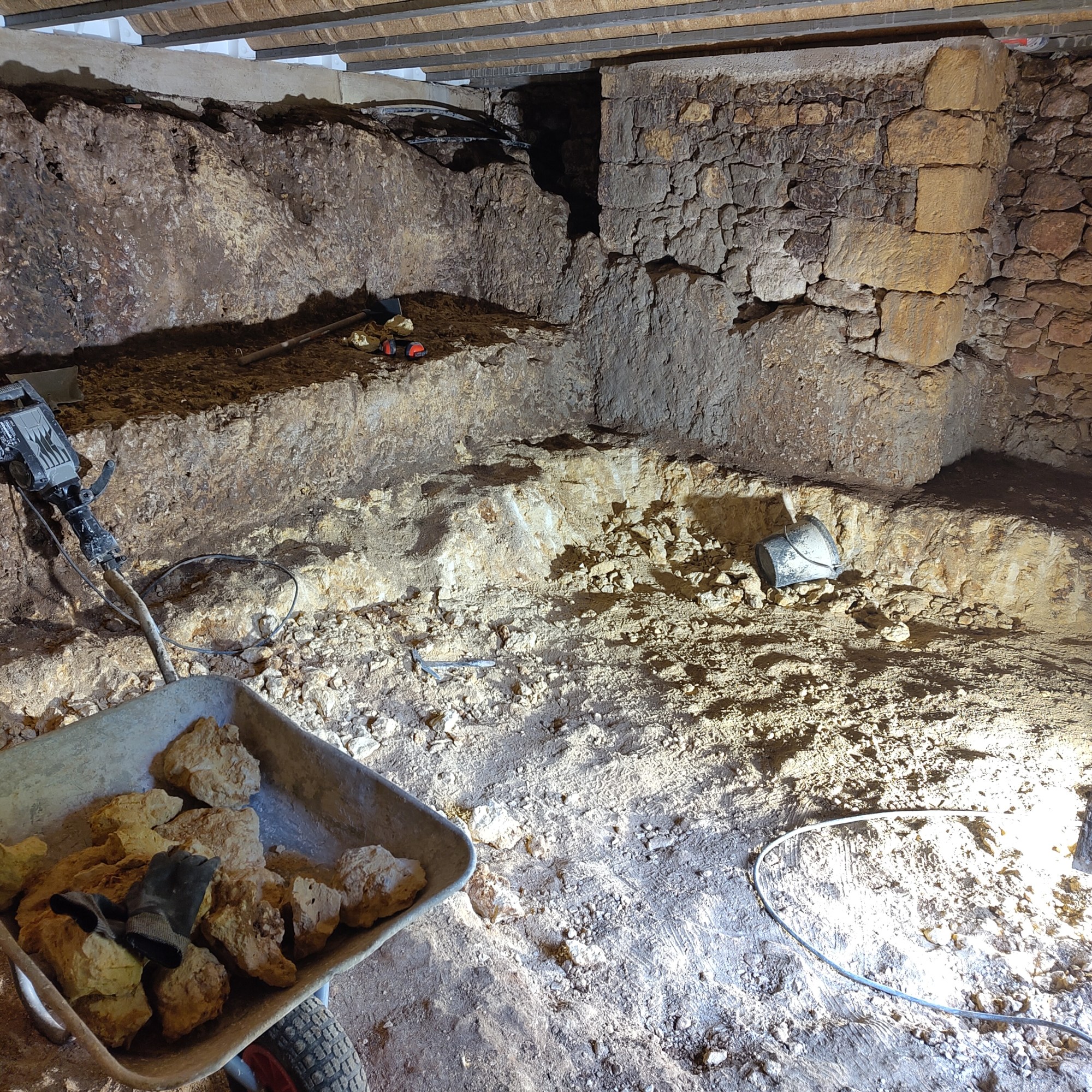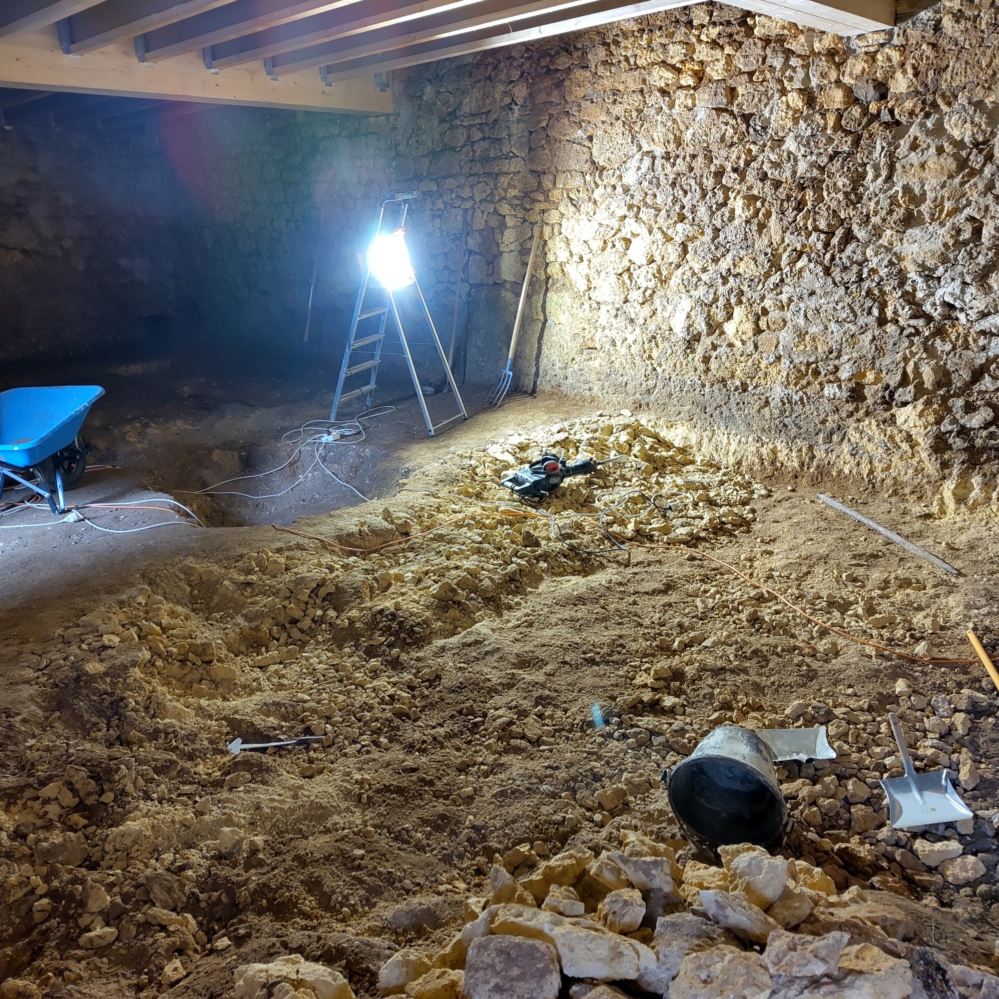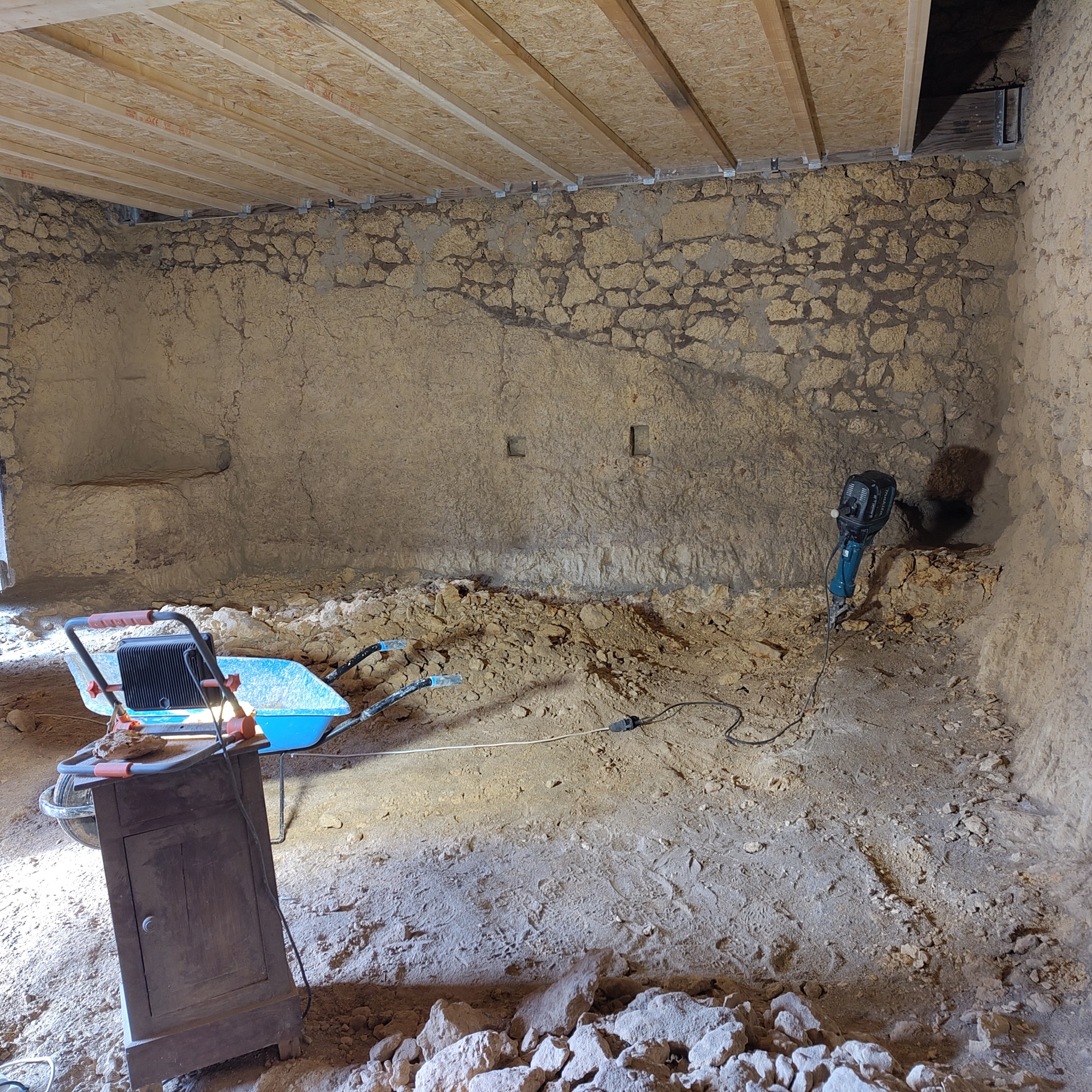 Nous avons également réemployé le plus d’éléments possible provenant des phases de démolition. Toute la roche issue des décaissements de la grange et de la salle troglodyte sert de base à notre parking et dans les remblais.