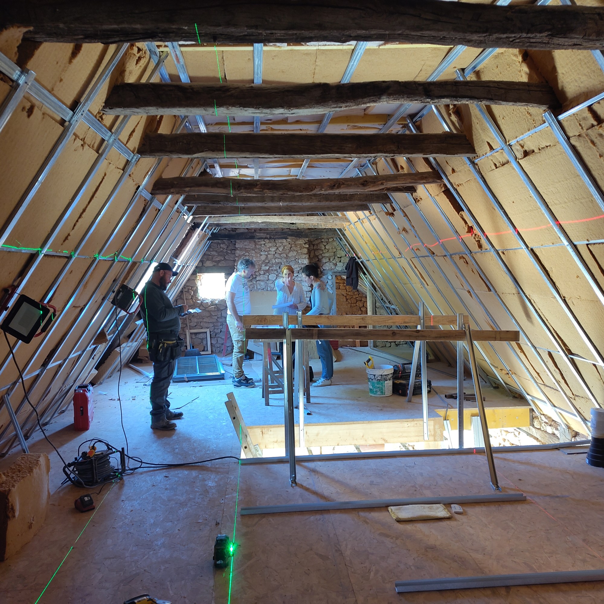 - Des isolants biosourcés : fibre végétale et coton/lin/chanvre pour la maison principale, ouate de cellulose produite dans le sud-ouest pour la grange